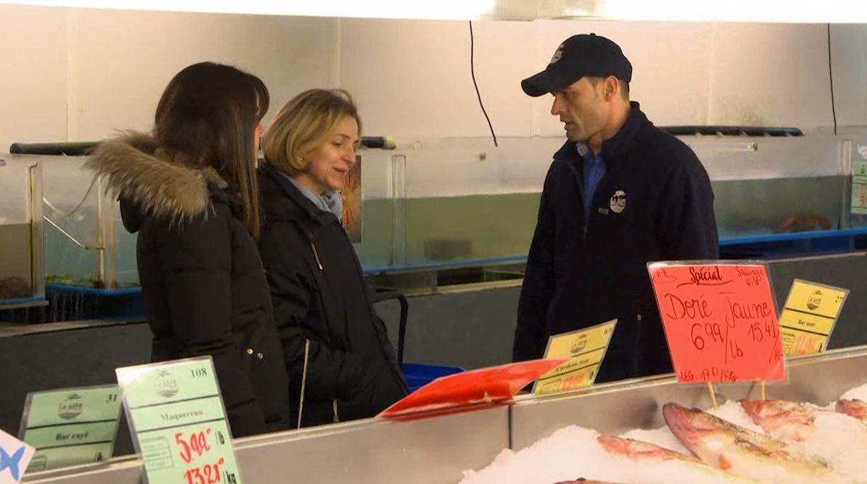 Le poissonnier François-Xavier Dehédin explique à des clients la provenance des poissons en magasin.